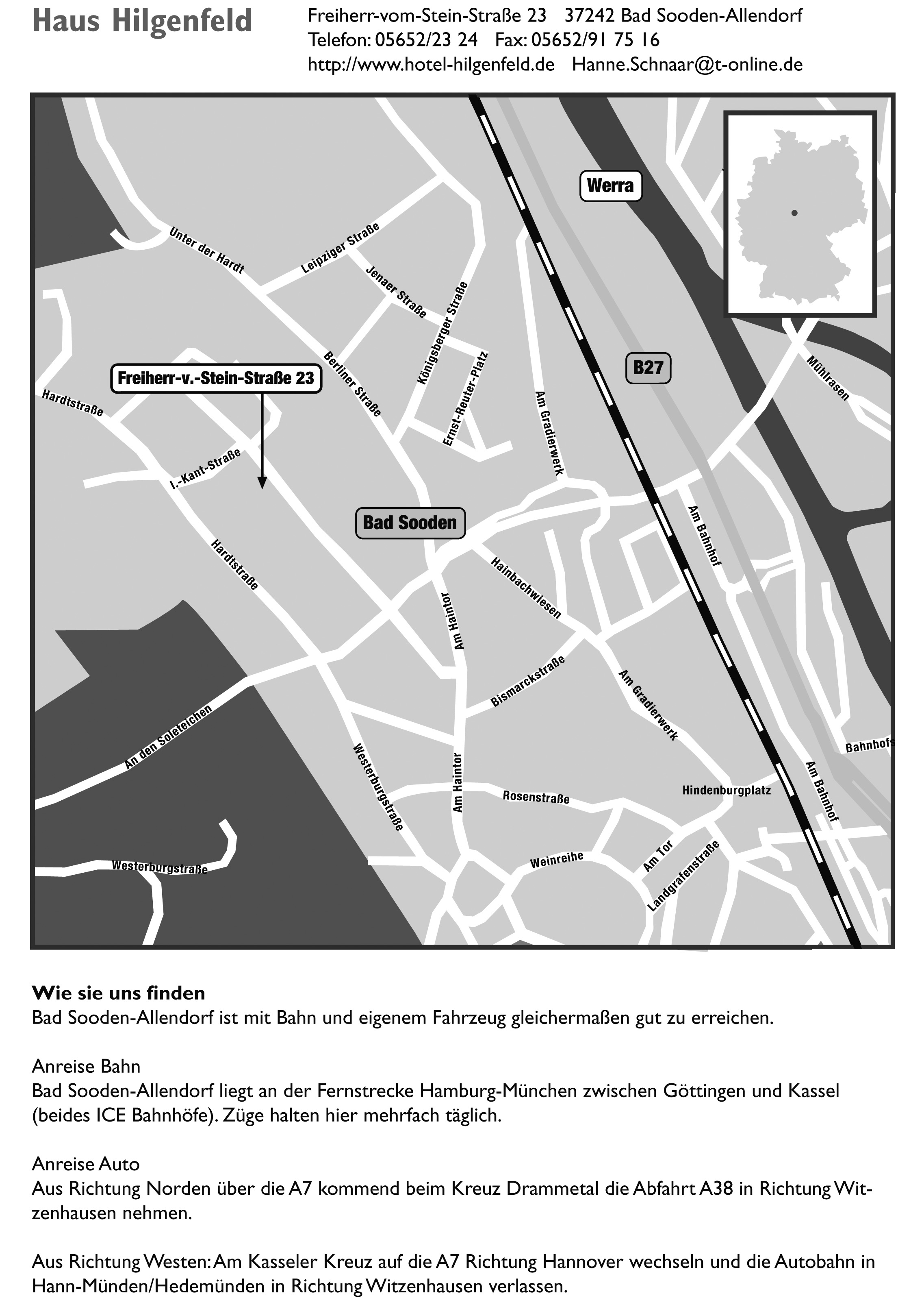 Aus Richtung Westen: Am Kasseler Kreuz auf die A7 Richtung Hannover wechseln und die Autobahn in Hann-Münden/Hedemünden in Richtung Witzenhausen verlassen.